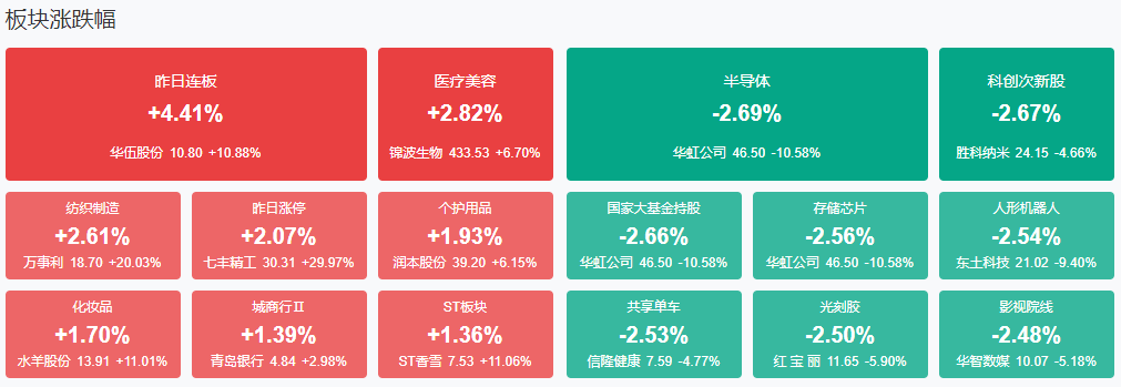 板块方面,纺织制造、美容护理、银行、电力等板块涨幅居前,半导体、人形机器人、智谱AI、影视等板块跌幅居前。截至收盘,沪指跌0.26%,深成指跌0.84%,创业板指跌0.99%。