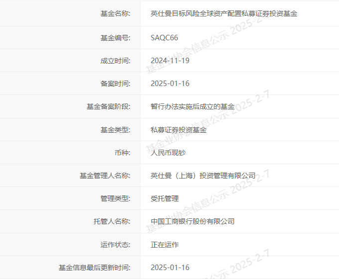 除了宽立私募基金之外,全球知名对冲基金英仕曼旗下的英仕曼(上海)投资管理有限公司也在今年1月备案了一只新产品——英仕曼目标风险全球资产配置私募证券投资基金。
