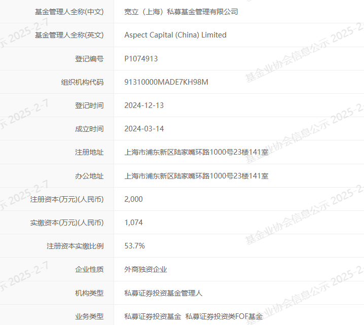 资料显示,宽立私募基金由英国知名量化机构宽立资本100%控股,公司于2024年3月14日成立,于2024年12月13日在基金业协会登记为私募证券管理人,注册资本2000万元人民币。