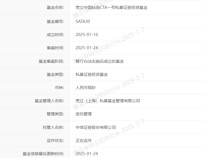 数据显示,宽立中国钻选CTA一号私募证券投资基金于今年1月16日成立,并于今年1月24日完成备案。基金类型为私募证券投资基金,托管人为中信证券。