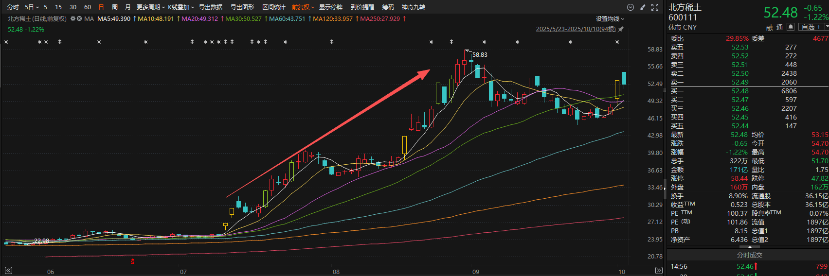轻稀土龙头北方稀土预计归母净利润为15.1亿元-15.7亿元,同比增加272.54%-287.34%。报告期内,公司紧抓市场变化,强化预算管理与降本增效,科学组织生产,加强市场研判和营销运作,推进重点项目建设和科研创新,主要产品产销量同比增长,推动经营业绩大幅上升。北方稀土同时公告称,根据稀土精矿定价方法及2025年第三季度稀土氧化物价格,经测算并经公司总经理办公会审议通过,2025年第四季度稀土精矿交易价格调整为不含税26205元/吨(干量,REO=50%),REO每增减1%、不含税价格增减524.10元/吨。此前,北方稀土7月10日公告,第三季度稀土精矿交易价格调整为不含税19109元/吨。以此估算,此次价格环比上涨37.13%。二级市场方面,北方稀土自7月低点迄今股价累计最大涨幅达142.1%,公司最新收盘价52.48元/股,总市值1897亿元。
