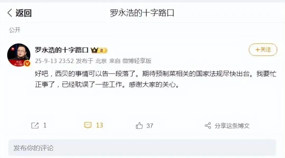 13日晚,罗永浩微博最新发文称西贝的事情可以告一段落了,全文如下:
