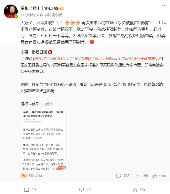 1.我不反对预制菜,在某些情况下,我甚至会主动选择预制菜,比如图省事儿,赶时间,没胃口时对付一下等等。2.既然预制菜合法,餐馆当然有权使用预制菜,但消费者有权知道餐馆是否使用了预制菜。”