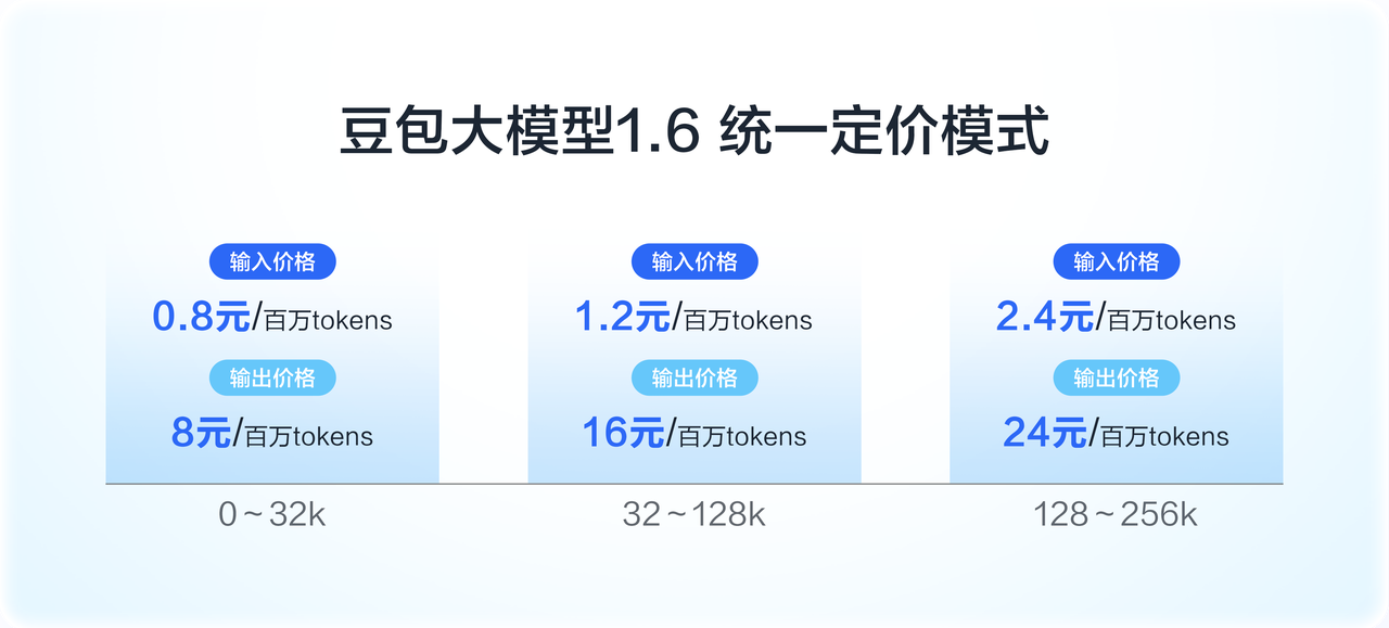 具体降价策略上,火山引擎采用的区间定价策略主要聚焦企业使用量最大的0-32K输入区间,32K表示模型可以处理并记住最多32000个Tokens(大语言模型处理文本的基本单位)的输入。该区间内豆包1.6的输入价格为0.8元/百万Tokens、输出8元/百万Tokens,综合成本只有豆包1.5深度思考模型或DeepSeek R1的三分之一。同一区间内,深度思考、多模态能力与基础语言模型统一价格。