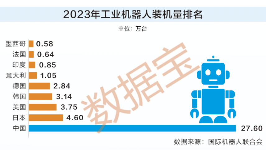 在机器人赛道,我国工业机器人产业近年来呈现爆发式增长,装机量占全球总量的52%以上,远超欧美日韩等传统机器人强国。国际机器人联合会(IFR)发布的报告显示,2023年全球工业机器人安装量达55.3万台,比上一年增长5%。其中,我国工业机器人安装量达到27.6万台,占比51.1%,高居全球第一。在人形机器人领域,全球前十强中有3~5家是中国企业。摩根士丹利今年一季度发布的《人形机器人100:绘制人形机器人产业链价值图谱》显示,在全球人形机器人产业链中,中国的份额高达63%,特别是在“身体”环节,中国集成的企业占比达到了45%。