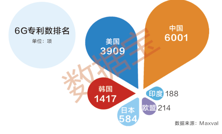 在6G产业方面,全球知识产权公司Maxval公布的数据显示,在6G相关专利方面,中国以6001项的数量占据主导地位,美国以3909项排名第二,韩国是1417项,日本是584项,欧盟是214项。