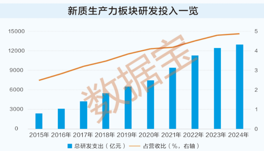 A股公司也同样在加大创新力度,为自身发展“逐梦未来”。数据宝统计,新质生产力板块连续10年保持研发支出增长,2024年逼近1.3万亿元,创出历史新高,占总营收比达到4.87%,占比同样创出历史新高。