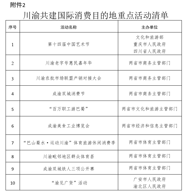 17.构建特色活动融合体系。联合举办成渝双城消费节、“巴山蜀水·运动川渝”“渝见广货”等系列主题活动,打造“成渝消费”全新IP,营造浓厚的消费氛围,提升川渝两地消费影响力、集聚力、吸引力和带动力。(责任单位:重庆市商务委、市文化旅游委、市体育局,有关区县政府;四川省商务厅、文化和旅游厅、省体育局,有关市州政府)