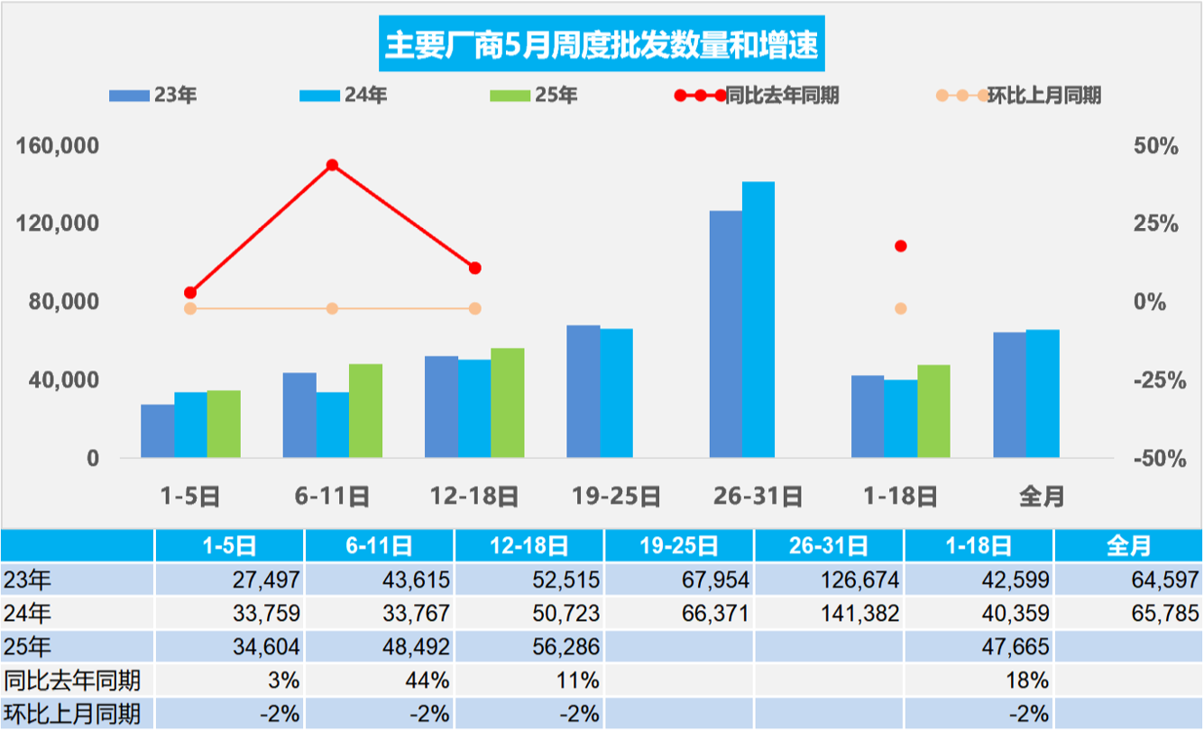 5月第三周全国乘用车厂商批发日均5.6万辆,同比去年5月同期增长11%,环比上月同期下降2%。