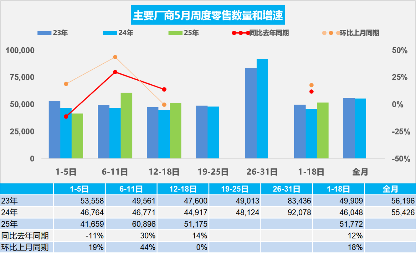 5月1-18日,全国乘用车市场零售93.2万辆,同比去年5月同期增长12%,较上月同期增长18%;今年以来累计零售780.4万辆,同比增长8%。