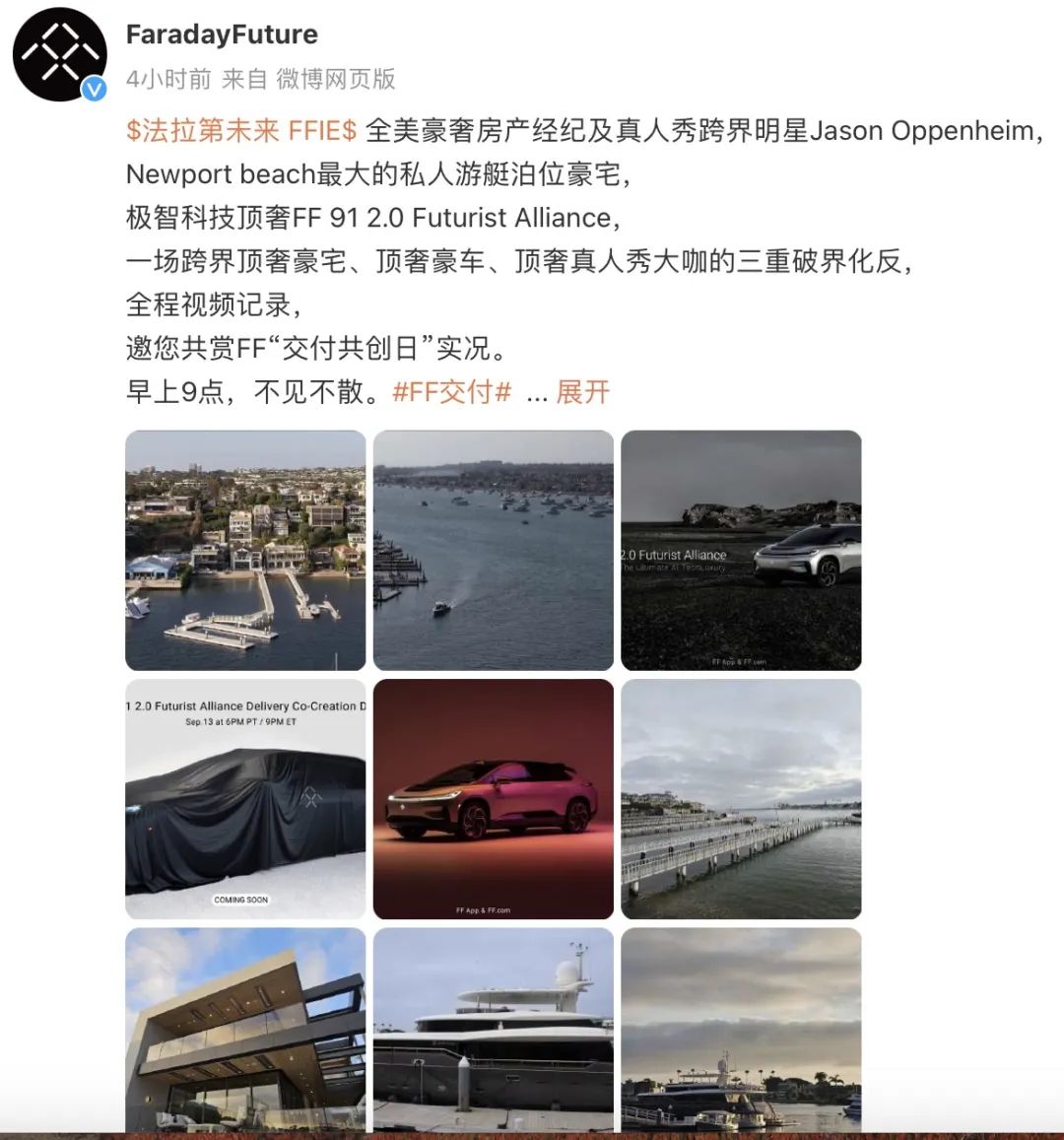 据证券时报·e公司记者了解到,9月14日,FF新车交付的车主是全美顶奢房产经纪大亨,同时也是真人秀跨界明星热剧“Selling Sunset”男一号和制片人Jason Oppenheim,交付现场定在Jason代理的坐落于加州顶奢富人区Newport Beach的游艇码头豪宅。