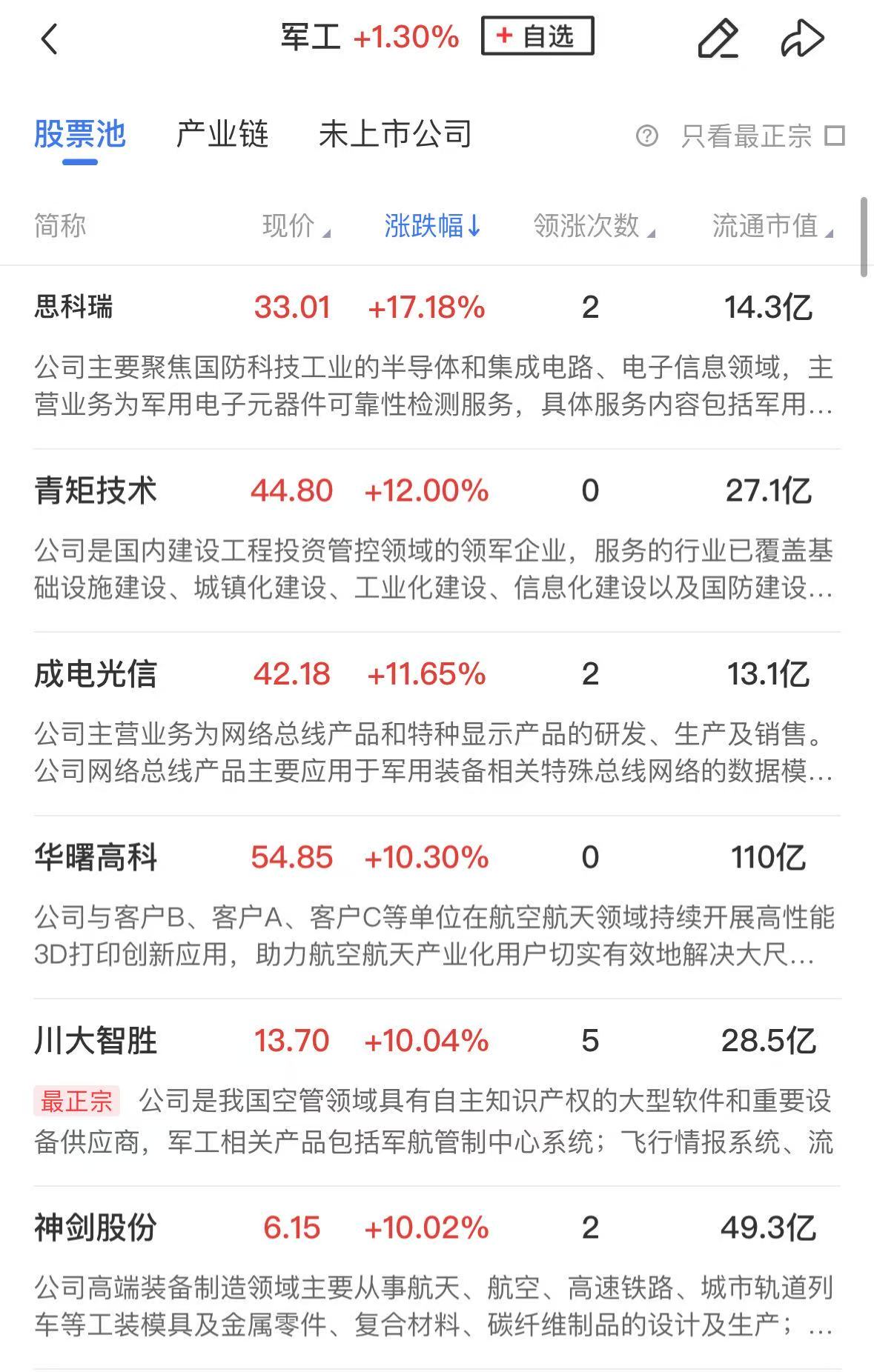 军工股震荡走强,火炬电子涨停,晟楠科技、迈信林、中航高科、三角防务、中科海讯等个股涨幅居前。