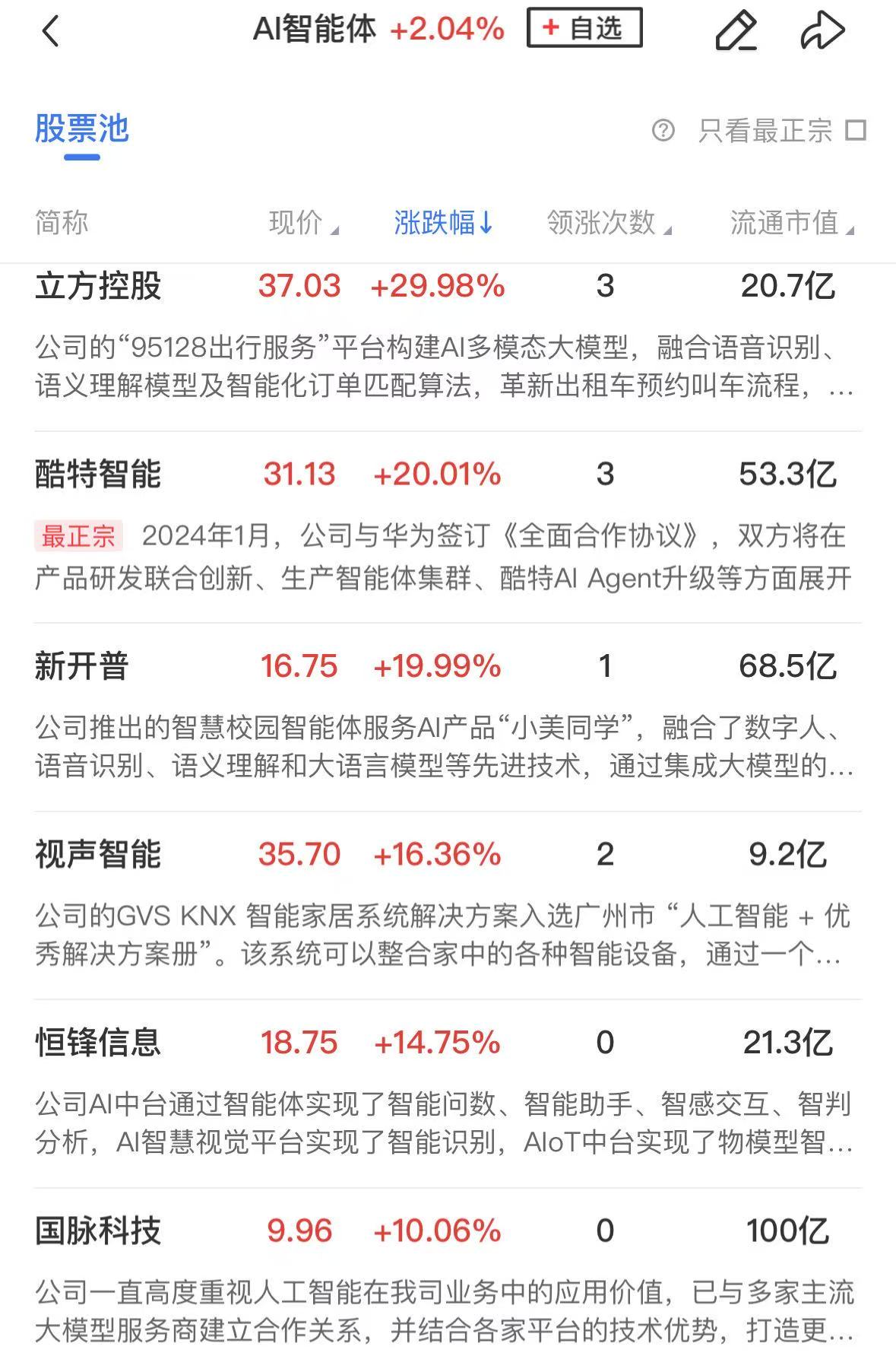 AI智能体概念股延续强势,酷特智能、新开普、用友网络、南兴股份、返利科技、致远互联等个股涨停,汉得信息、税友股份、蓝色光标等个股涨幅居前。