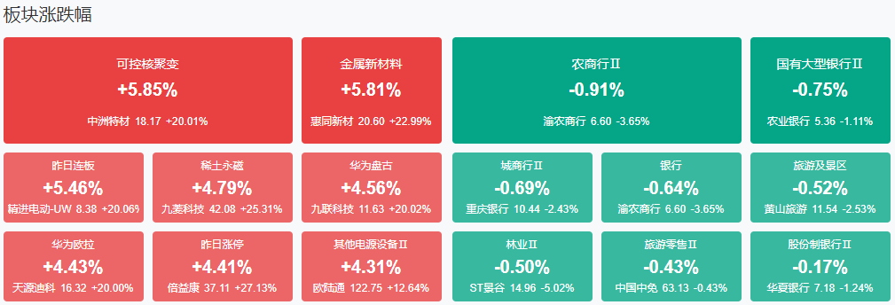 板块方面,可控核聚变、稀土永磁、鸿蒙、CPO等板块涨幅居前,银行等少数板块下跌。截至收盘,沪指涨0.94%,深成指涨1.66%,创业板指涨2%。