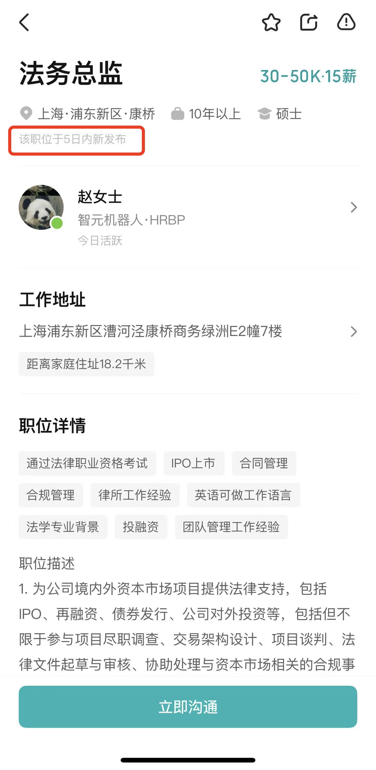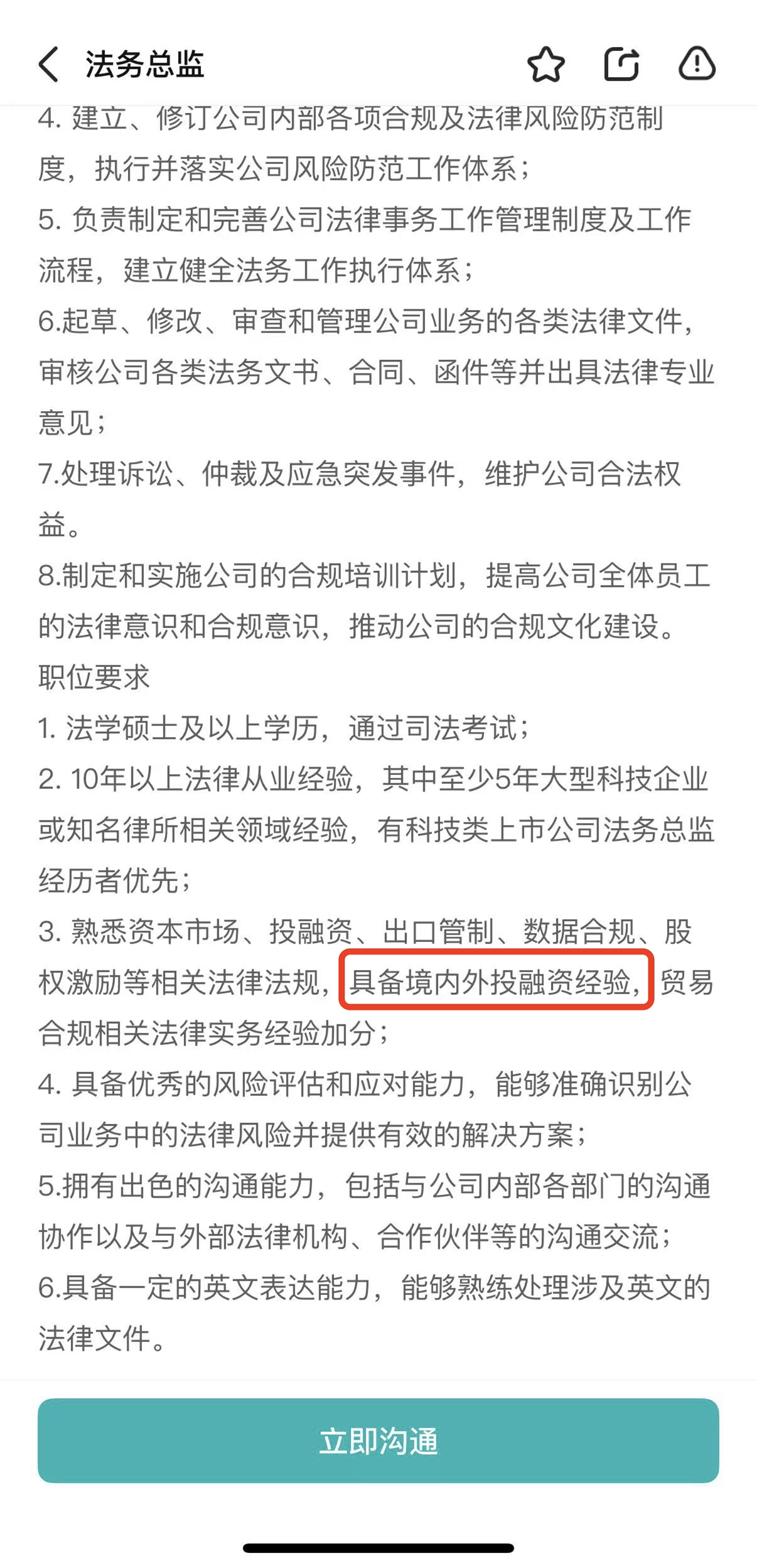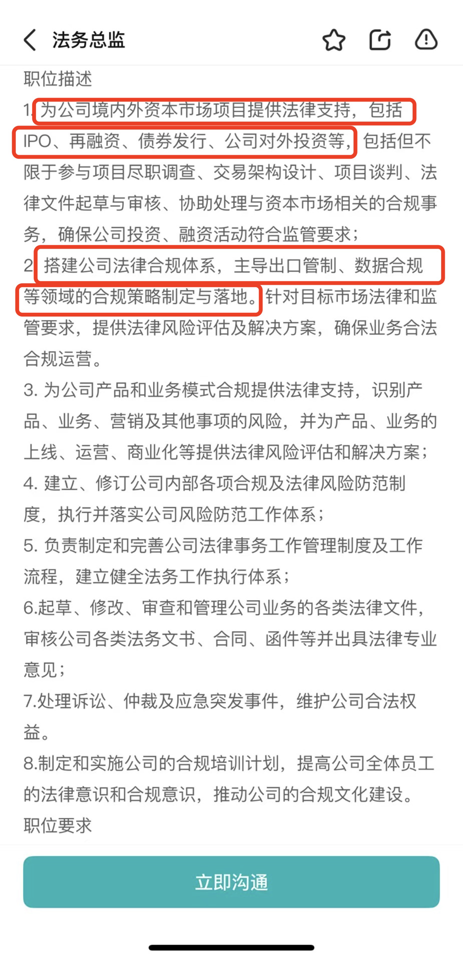 除了这个职位之外,智元机器人还同步释放了法务总监岗位,职责为为公司境内外资本市场项目提供法律支持,包括IPO、再融资等,主导出口管制、数据合规等工作,要求候选人具备境内外投融资经验等。
