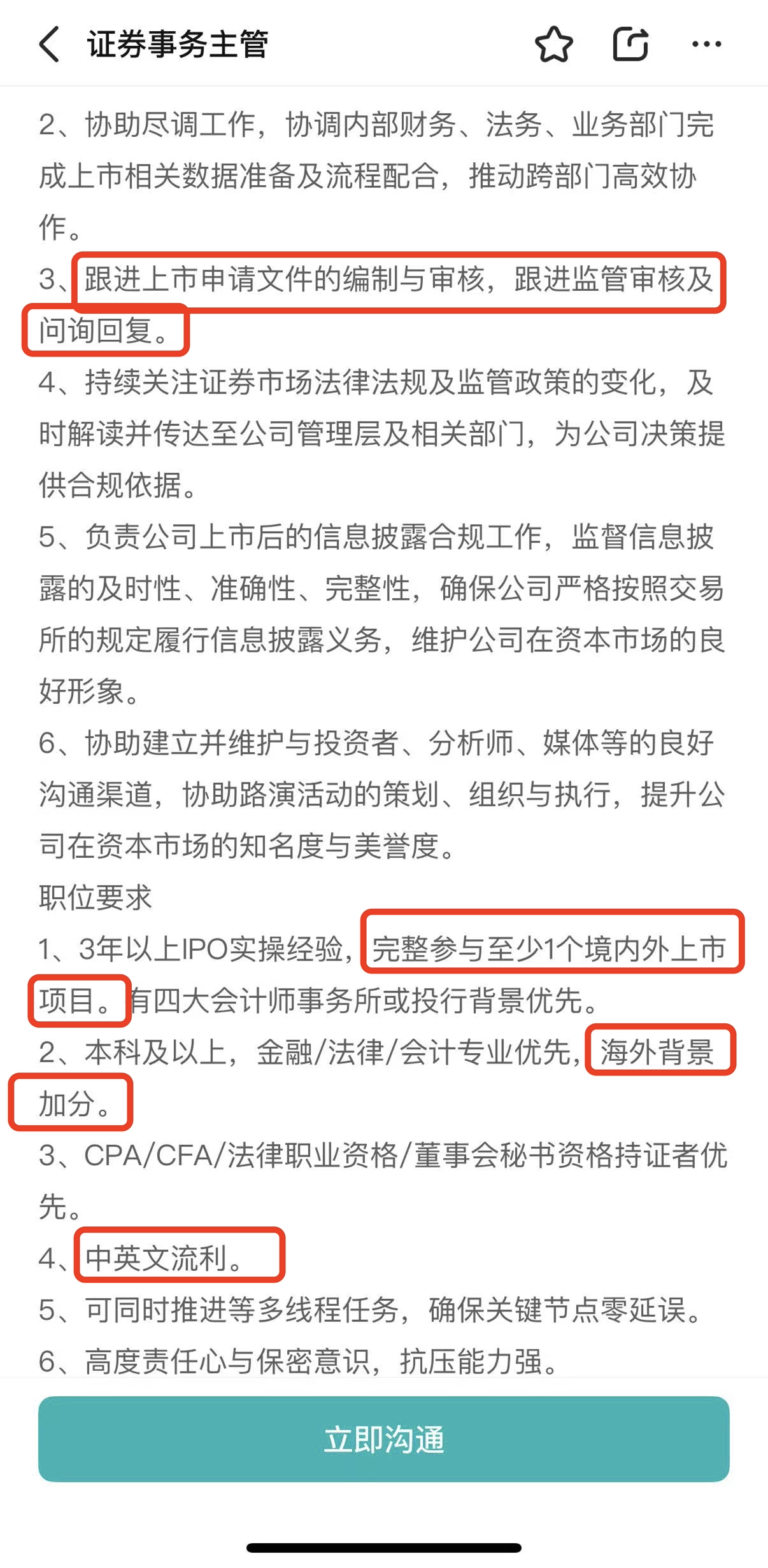 职位要求除了常规的资质要求和四大或投行经验外,还要求候选人完整参与至少1个境内外上市项目,中英文流利,海外背景加分。