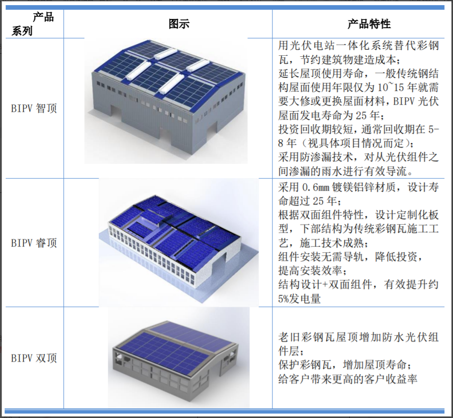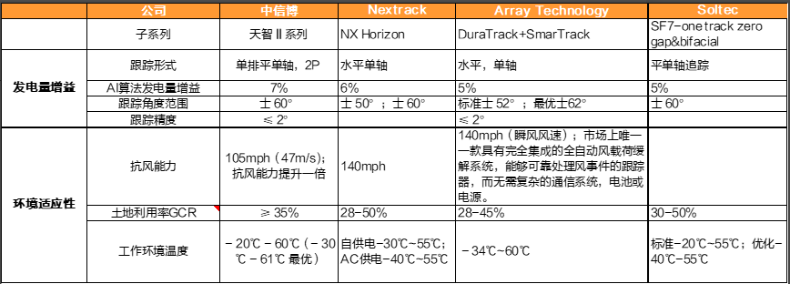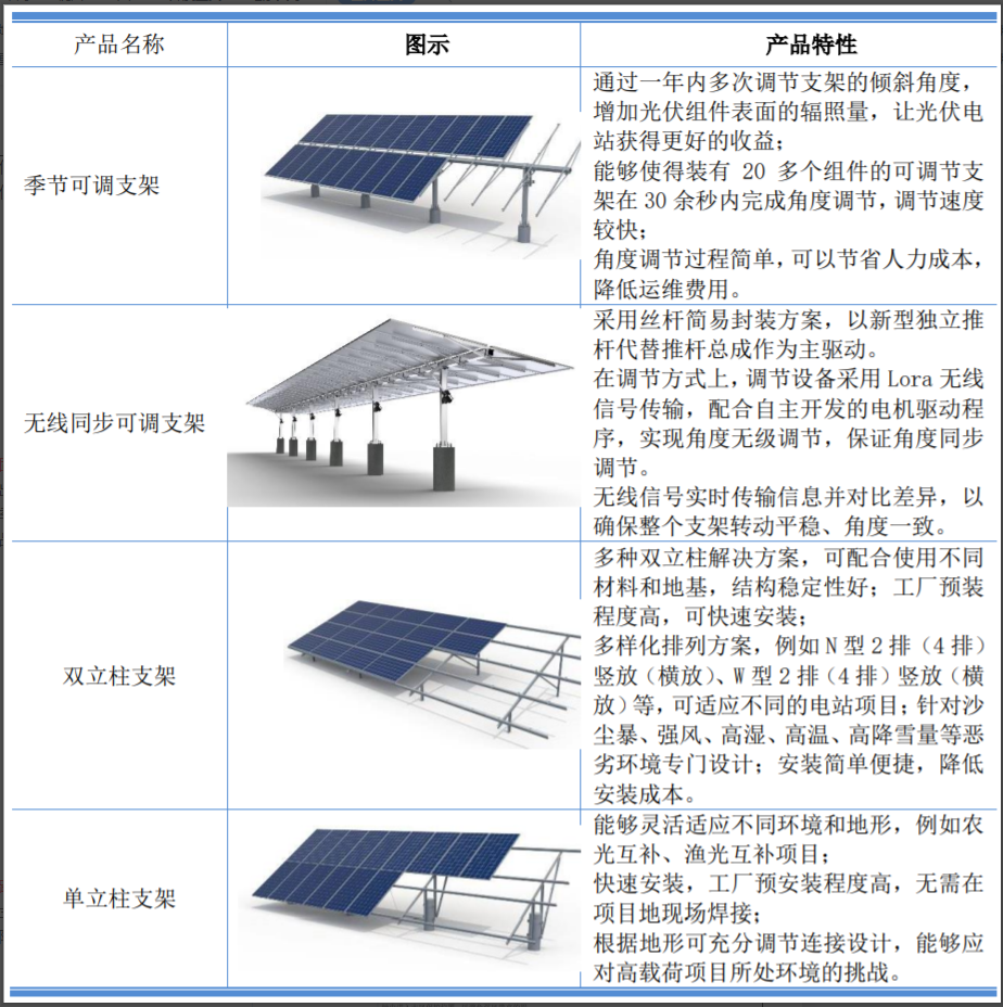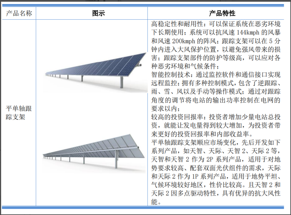 跟踪支架跟踪支架在技术门槛、发电效率上(年度增加20%发电量)明显高于固定支架,是公司的核心产品,主要分为平单轴跟踪支架、斜单轴跟踪支架等产品。平单轴产品的市场占有率较高,公司目前推出的天际、天智系列跟踪系统都属于平单轴跟踪系统的一种。公司跟踪支架类产品示例如下:
