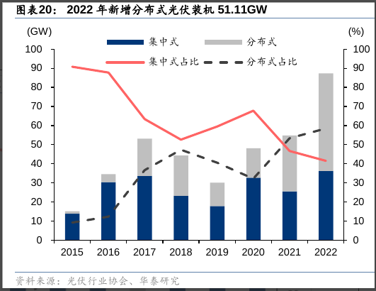 2021年,集中式地面电站新增装机25.6GW,占全年光伏新增装机的46.65%,比2020年新增装机量同比下降约22%。公司主营产品光伏支架主要应用于集中式地面电站,2021年支架收入占公司销售收入的。