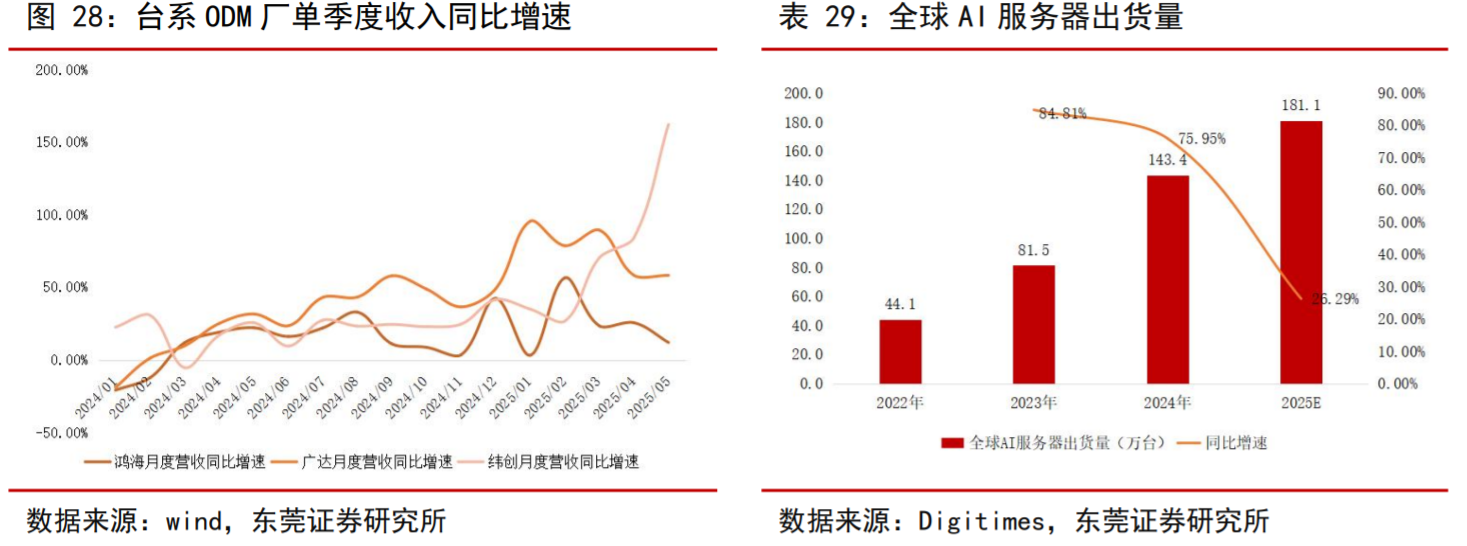 台系ODM厂月度营收高增,AI服务器出货动能充足。鸿海、广达、纬创等主要台系ODM厂近月营收增速同比高增,主要受益于GB200服务器出货节奏加快。其中鸿海在Q1业绩说明会表示,下游对AI及通用服务器需求强劲,公司Q1服务器营收同比增长超过50%,并表示产品加速量产爬坡,预计Q2AI服务器收入同比、环比将翻倍增长,逐季向好。广达同样表示Q1AI及通用服务器需求强劲,并预计随着Blackwell平台产品放量,Q2AI服务器收入占整体服务器收入的比重超过70%。据Digitimes预测,今年全球AI服务器出货量有望达到181.1万台,同比增长26.29%,其中搭载HBM的高阶AI服务器出货量将达到108.8万台,同比增长40%以上。市场规模方面,IDC预计今年全球AI服务器市场规模有望增长至1,587亿美元,同比增长26.86%。