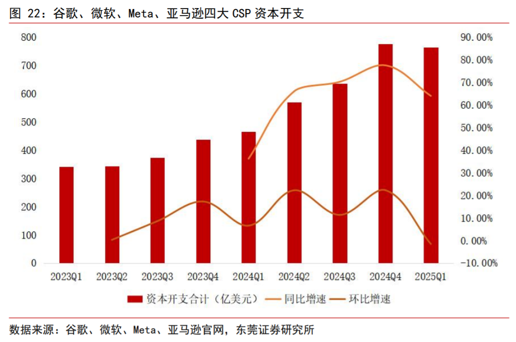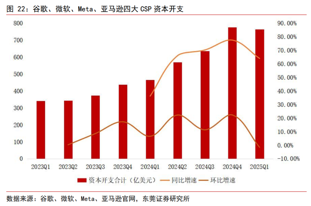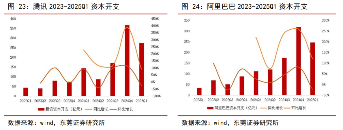 国内方面,腾讯在Q1业绩说明会上指出,AI显著赋能广告、游戏、云计算等核心业务线条,Q1资本开支约为275亿元,同比大增91%,主要用于GPU和服务器投资。阿里Q1AI相关产品收入连续七个季度实现三位数的同比增长,并且指引阿里云营收会持续加速增长,Q1资本开支约为246亿元,同比增长121%。今年2月,阿里宣布2025-2027年将投入超过3,800亿元人民币,用于建设云和AI硬件基础设施,总额超过去十年总和。