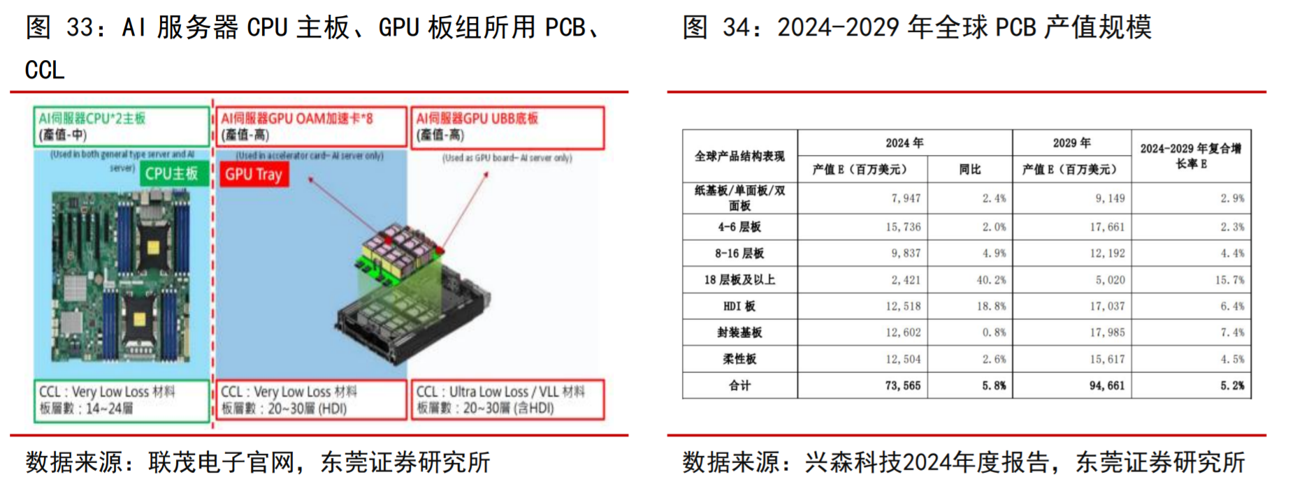 AI服务器PCB迎来量价齐升。相较于传统服务器,AI服务器PCB主要新增在GPU模块,包括GPU加速卡OAM和模组板UBB,同时AI服务器对高频高速信号传输、高集成度、散热等要求高,将会加大对高多层板、HDI需求,同时会搭配更高等级覆铜板材料,价值量也会进一步加大。据Prismark预测,2029年全球PCB产值有望达到946.61亿美元,2024-2029年复合增速约5.2%;其中18层板及以上、HDI等产品复合增速较高,分别为