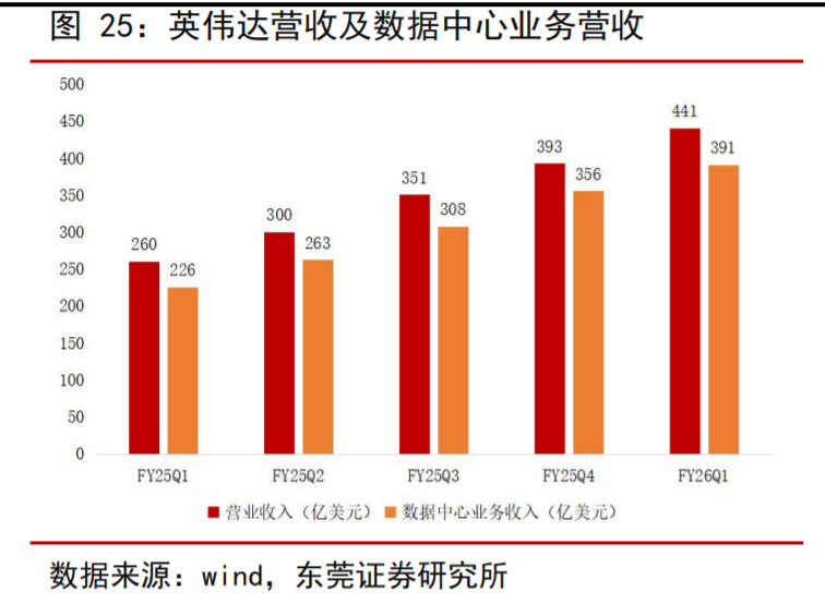 英伟达FY26Q1业绩略超预期,Blackwell出货加快。近期英伟达公布FY26Q1业绩,营收441亿美元,超市场预期的433亿美元;其中数据中心业务收入391亿美元,略低于市场预期的392亿美元;非GAAP毛利率61%,若剔除H20影响,毛利率将达到71.3%。本季度Blackwell贡献数据中心业务收入近70%,Hopper到Blackwell的产品过渡期基本完成,同时随着制造良率提升,服务器机架正加速出货,超大CSP平均每周部署近1,000台NVL72机架,并预计产量进一步提高。目前公司已经向主要CSP提供GB300样品,由于GB300采用与GB200相同架构、物理尺寸、电气和机械规格,预计后续新品有望在前代产品经验下快速爬坡放量。展望Q2,英伟达预计营收为450亿美元,上下浮动2%,预计所有平台的收入将实现温和的环比增长,非GAAP毛利率为72%,上下浮动50个基点。