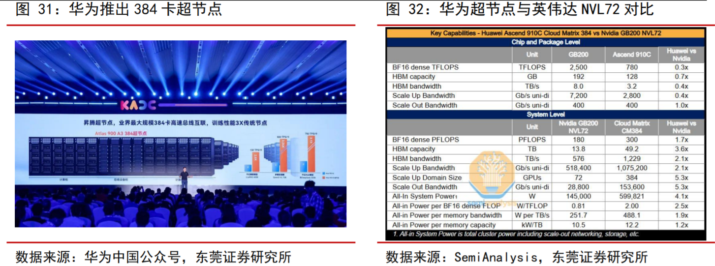 华为推出384超节点,集群能力大幅提升。5月23日,在2025年鲲鹏昇腾开发者大会上,华为正式推出CloudMatrix384超节点集群,由12个计算柜和4个总线柜构成,通过新型高速互联总线实现384张卡互联,最高提供300Pflops的算力规模,比业界同类产品领先67%。目前基于CloudMatrix的超节点集群已经在芜湖、贵安、内蒙等地规模上线。超节点集群的推出,标志着国产AI算力性能进一步提升,市场空间有望打开。