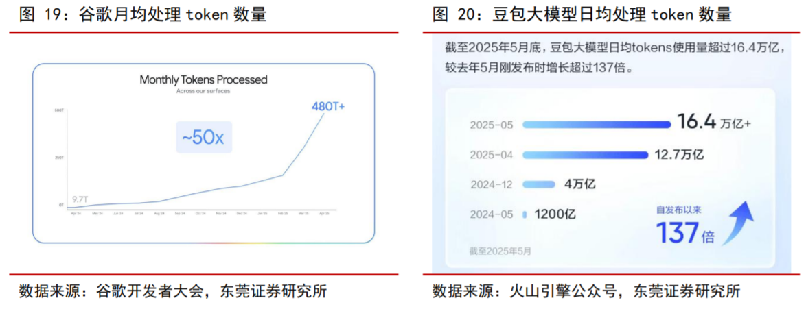 推理带动Token消耗量增加。随着模型性能提升以及深度思考模型广泛推出,模型在B端、C端应用进一步加快,带动token消耗量大幅增加。谷歌在今年I/O大会上指出,过去一年来,每月处理的token数量激增,从去年4月的9.7万亿增长至目前超过480万亿,增加幅度接近50倍。豆包大模型方面,截至5月,日均tokens使用量达到16.4万亿,相较于去年5月增长137倍。未来随着Agent、物理AI等领域广泛应用,所需要的推理算力需求将进一步爆发。英伟达CEO黄仁勋在2025年GTC大会表示,由于AgenticAI和思考模型的出现,目前所需的计算力将比去年预想的多出100倍。