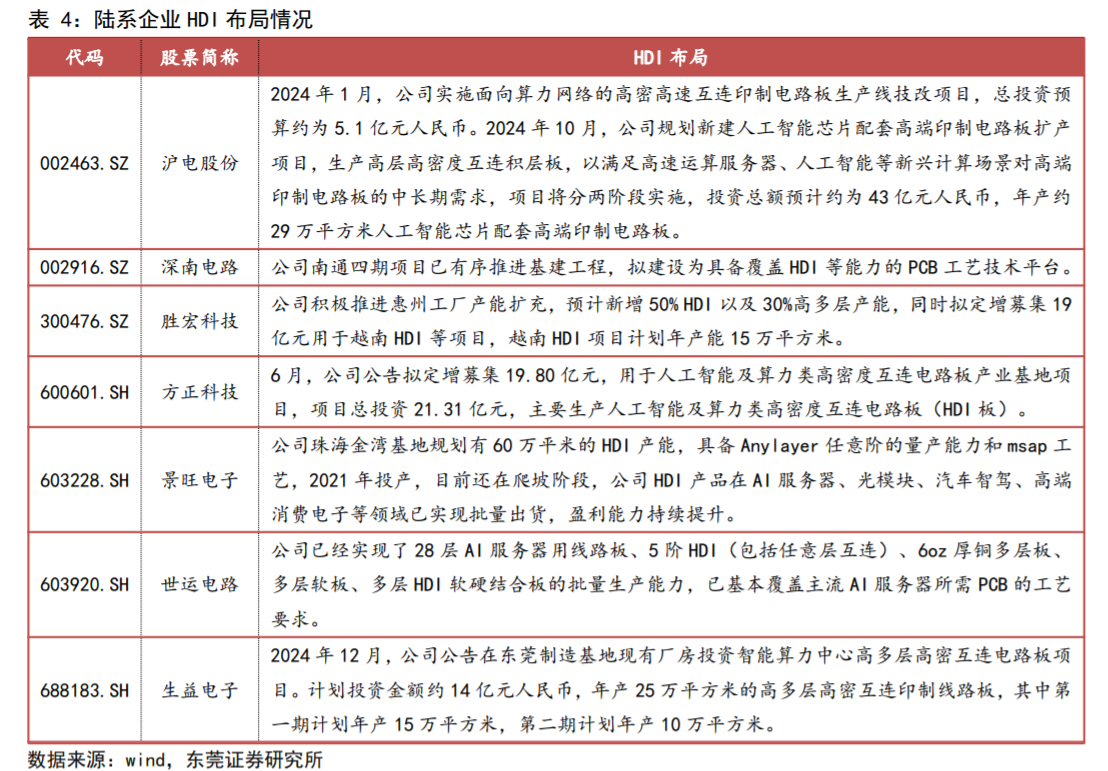 据TPCA数据,全球HDI市场主要由台系、陆系企业所主导,其中台系厂商市占率约为38.7%,陆系厂商市占率约为32.9%,主要陆系厂商包括沪电股份、胜宏科技、深南电路、景旺电子等。随着AI算力对高端HDI需求加大,多家陆系厂商积极扩充HDI产能,其中胜宏科技积极推进惠州工厂HDI及高多层产品的产能扩充,同时拟定增募集19亿元用于越南HDI等多个项目。