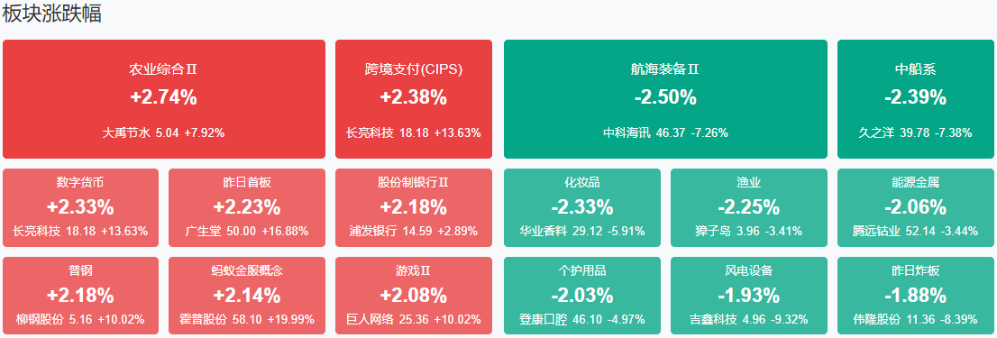 板块方面,游戏、稳定币、银行、电力等板块涨幅居前,固态电池、稀土永磁、有色金属、军工电子等板块跌幅居前。截至收盘,沪指涨0.41%,深成指涨0.05%,创业板指涨0.18%。