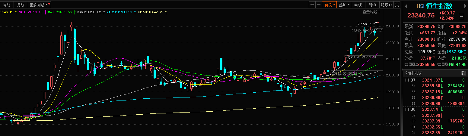 恒生指数盘中涨超3%突破去年10月7日高点,创3年新高!
