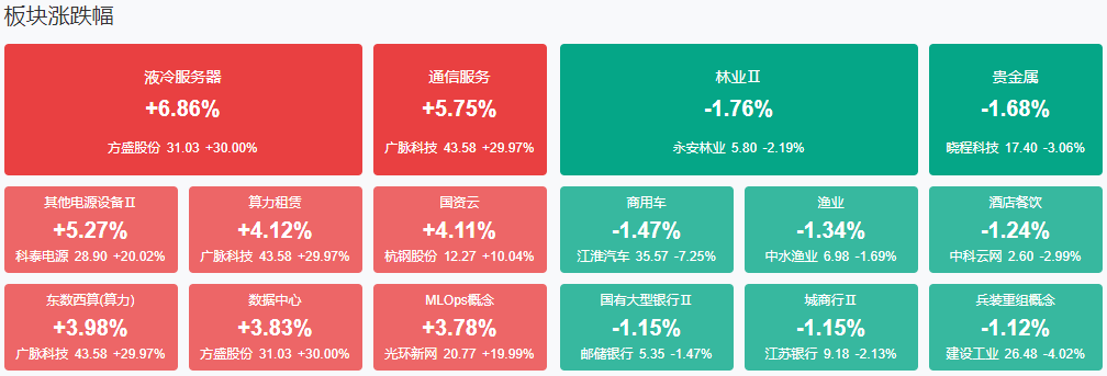 板块方面,液冷服务器、国资云、算力、半导体等板块涨幅居前,零售、银行、服装、医药商业等板块跌幅居前。截至收盘,沪指涨0.77%,深成指涨1.62%,创业板指涨2.23%。