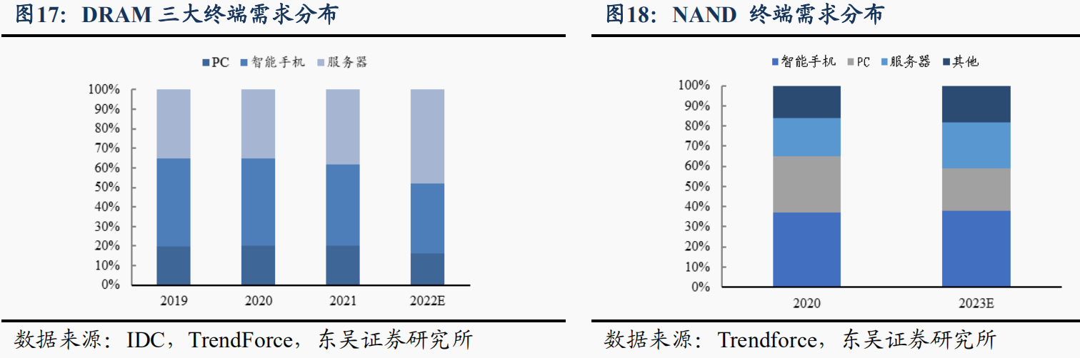 智能手机、服务器和PC是存储三大终端需求驱动力,其中智能手机需求占比最大。据TrendForce预估,2023年mobileDRAM单机搭载容量增速约5%;同时随着5G智能手机渗透率逐步提升,iPhone产品组合、Android高端机种向更高容量升级,中低端机种储存空间则随硬件规格升级而提高,东吴证券预估2023年NANDFlash单台智能手机位元需求增长率为22.1%。