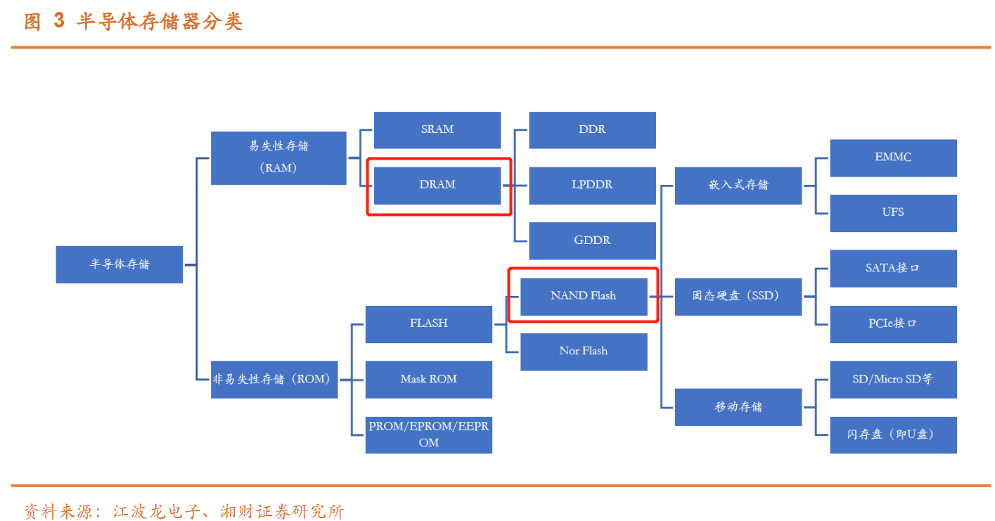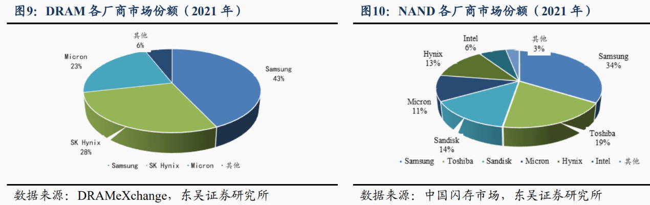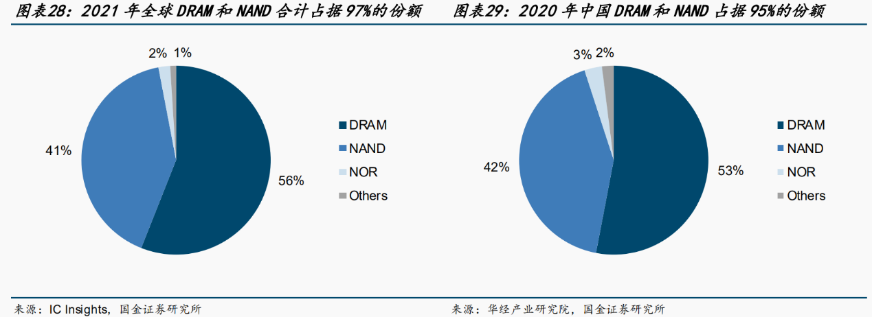 存储是集成电路产业中收入占比第二的子品类(2021年约28%),DRAM(动态随机存储器)和NANDFlash(闪存)是其中最重要的细分产品。美光相关数据显示一台人工智能服务器DRAM使用量是普通服务器的8倍,NAND使用量是普通服务器的3倍。根据ICInsights数据,2021年DRAM和NANDFlash在整个存储市场的合计占比约为97%,NOR占比为2%。2020年中国存储市场中DRAM和NANDFlash的合计占比为95%,NOR占比为3%。