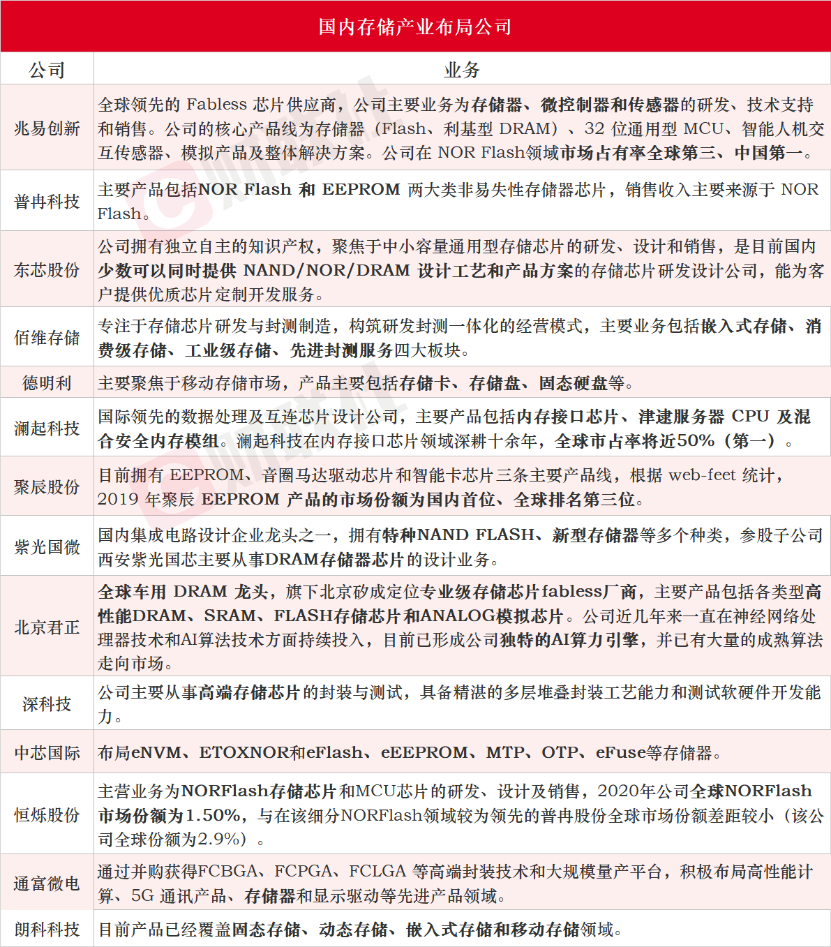 据财联社不完全统计,国内上市公司中有兆易创新、普冉科技、东芯股份、佰维存储、德明利、澜起科技、聚辰股份、紫光国微、北京君正、深科技、中芯国际、恒烁股份、通富微电、朗科科技布局存储相关业务。