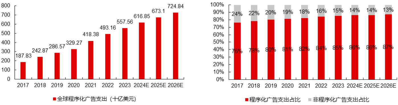 程序化广告市场空间广阔,千亿美元体量可期。在当下数字化营销浪潮中,广告主愈发注重投放的精准性与 效率,程序化广告凭借自动化、数据驱动的优势,契合市场需求。根据 Statista 的数据, 自2017年的1878.3亿美元起,全球程序化广告支出连年攀升,预计到 2026 年将达到 7248.4 亿美元,持续增长的趋势显著。此外,程序化广告支出在整体广告支出中的占比也逐年攀升,预计2026年占比将达到87%。