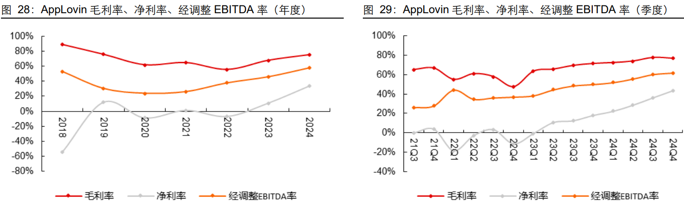 23Q3以来公司表现亮眼,盈利能力释放强劲增长动能,持续超预期。24Q4公司营业收入13.73亿美元,同比+44.0%;净利润 5.99 亿美元,同比+247.9%;经调整 EBITDA 8.48 亿美元,同比+78.1%;净利率和经调整 EBITDA 率分别为 43.6%和 61.8%。各项财务数据均有明显的增长,彰显公司不断增长的盈利能力,原因主要系 AXON2.0 算法提升促使公司业务进入“数据-算法-广告主预算-流量”正向飞轮效应,业务实现强劲增长。毛利率快速提升,费用控制成效显著。