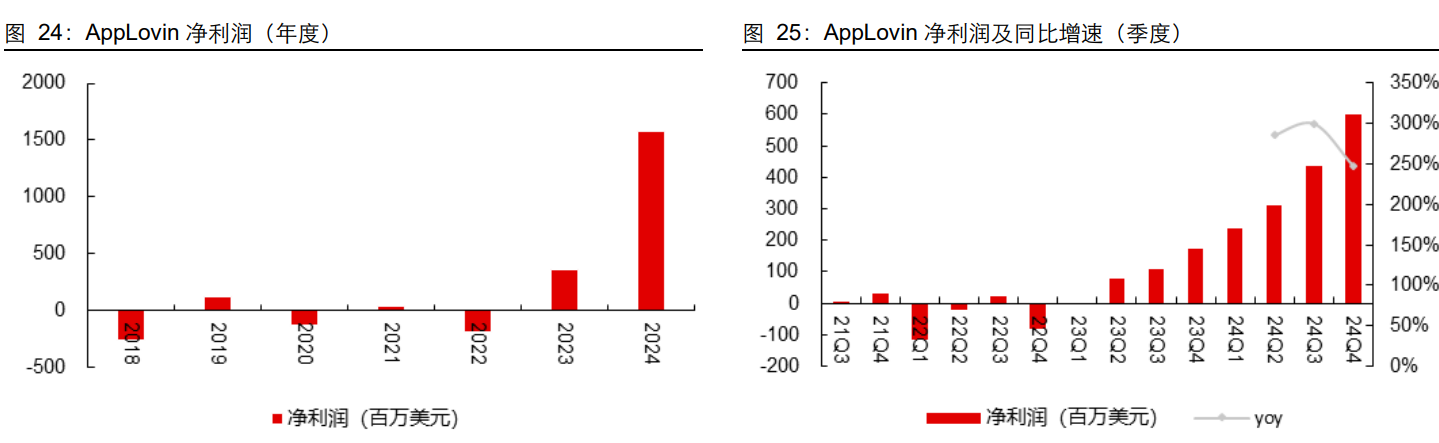 公司指引25Q2广告收入为11.95~12.15亿美元(同比+68%~71%,一致预期11.16亿美元),广告业务调整后EBITDA为9.70~9.90亿美元(调整后EBITDA率81%)。展望2025年,公司将继续通过优化AI广告模型、提升个性化广告体验、拓展AI Agent自助服务等方式,进一步提升广告业务的竞争力和盈利能力。看好公司游戏广告行业格局的优化、下一代AI广告引擎持续发力、电商等领域的拓展、盈利大幅改善带来的股东回报等都将构成公司股价上行的驱动力。