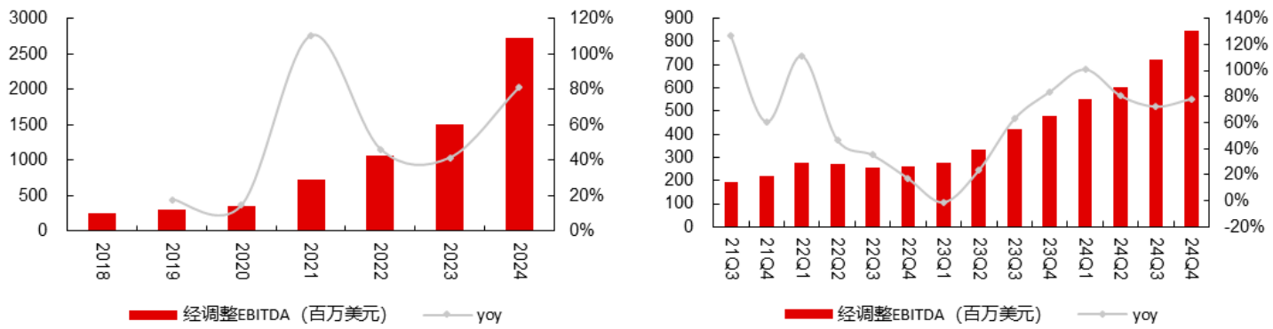 1Q25广告业务收入达11.59亿美元(同比+71%,占比78.1%),调整后EBITDA为9.43亿美元(同比+92%,利润率81%)。公司持续优化广告投放技术,通过AI驱动的精准营销,进一步提升广告效果与用户体验,吸引更多广告主增加投放预算,推动广告业务高速增长。