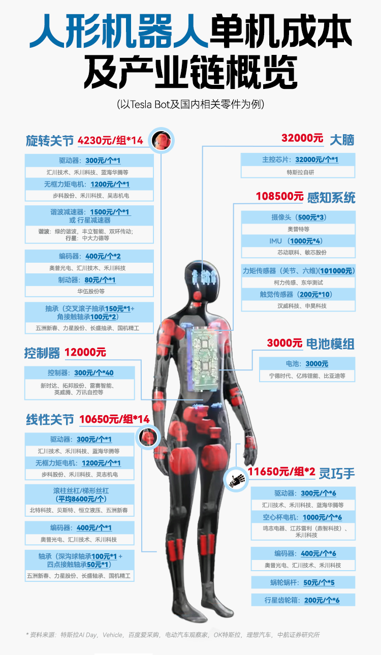 近期人形机器人概念股持续火热,人气股泰尔股份9连板,埃夫特自11月以来涨幅超3倍。人形机器人单机成本分别是多少?潜在供应商有哪些?一图看懂。