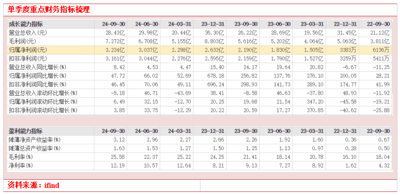 公司2024年前三季度实现营收78.9亿元,同比增长5.9%;归母净利润8.6亿元,同增长55.1%,毛利率24.3%,同提高4.3pct,归母净利率10.9%,同增长3.5pct。其中第三季度营收28.4亿元,同比增长8.4%,归母净利润3.2亿元,同比增长47.7%,毛利率25.6%,同环比分别提升4.2pct、3.2pct,归母净利率11.4%,同环比分别提升3pct、1.2pct。