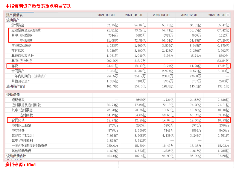 截至三季度末,公司存货及合同负债分别为23亿元、12.8亿元,同比增长31%、19%,待交付产品显著增长,在手订单充沛。
