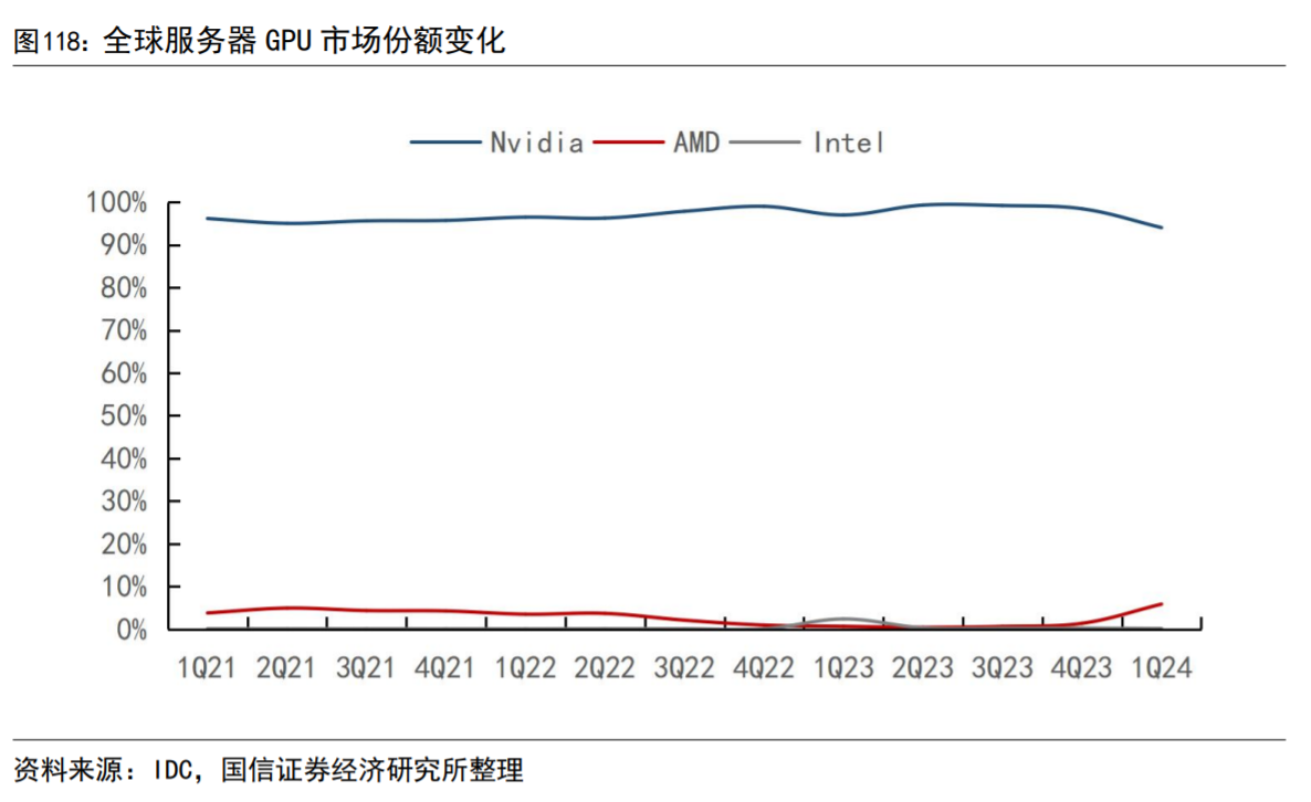 海外厂商资本开支仍旧不减,英伟达在服务器GPU市场仍占据极高市场份额。英伟达长期占据GPU市场几乎垄断地位,前期份额均保持在95%以上,24Q1受到AMD冲击略有下滑,但份额也达到了94%。ADM于23年底推出新一代AI/HPC专用加速器InstinctMI300系列,在市场对AI算力需求井喷的背景下,MI300销量增长迅速。MI300的上市给市场多了一种选择,也相对更具性价比,但目前市场英伟达仍占据统治地位。