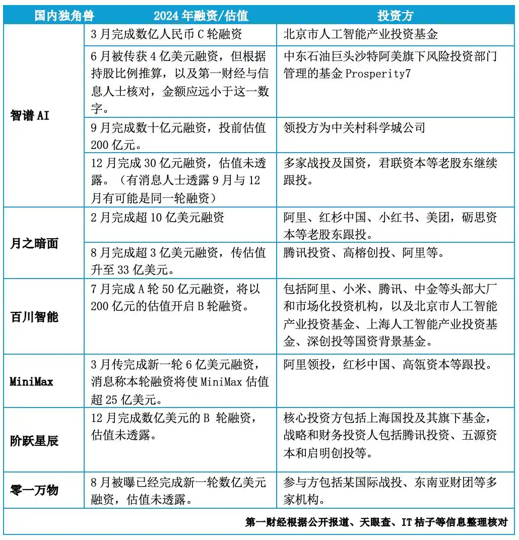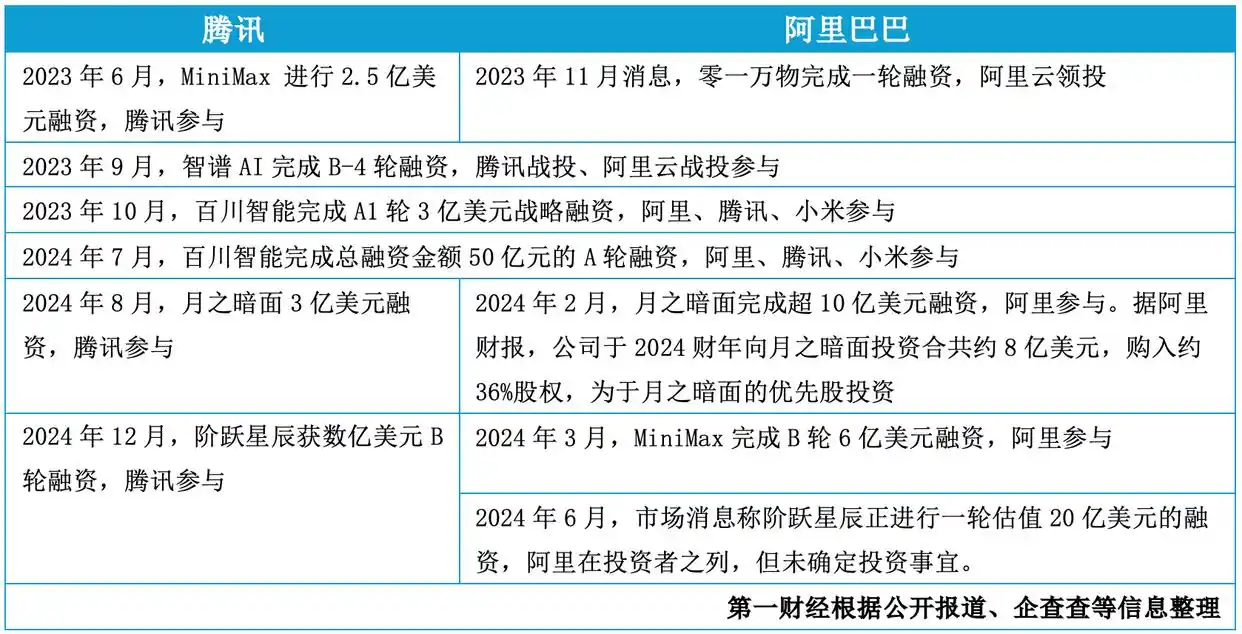 腾讯和阿里都投资的大模型独角兽包括MiniMax、智谱AI、百川智能和月之暗面,阿里另外投资了零一万物,此前6月阿里曾传投资阶跃星辰,但后续未见消息。腾讯则在阶跃星辰最近一轮融资中出手。