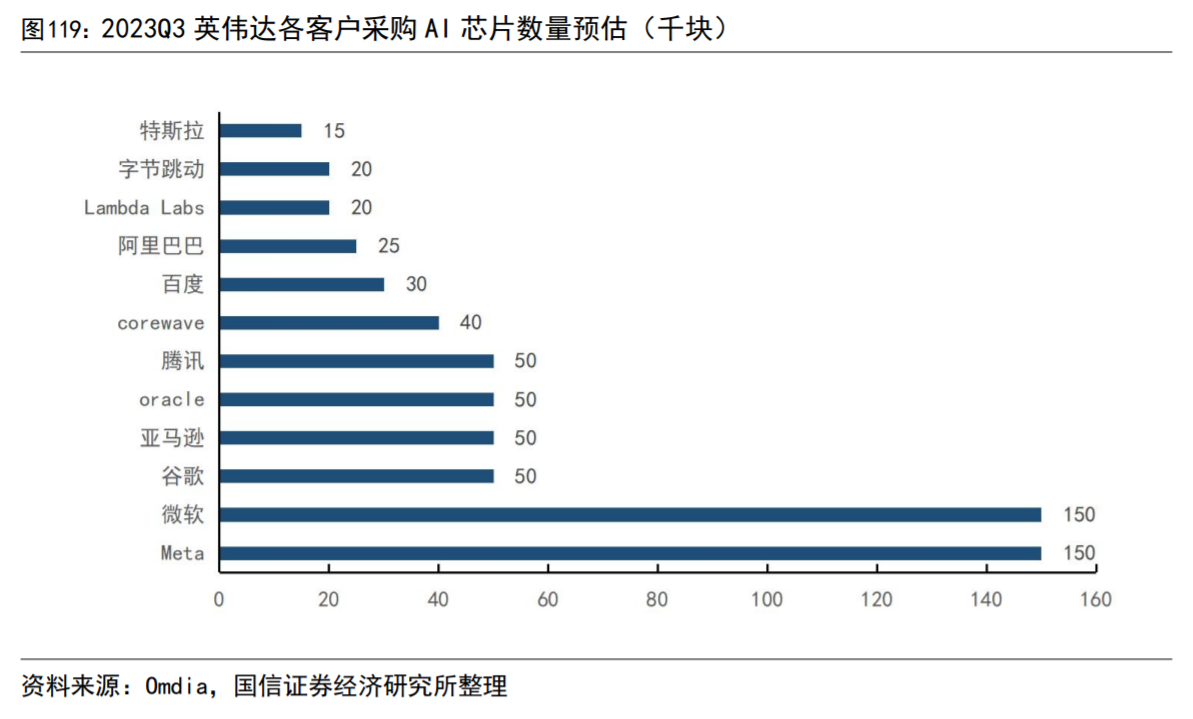 Meta和微软向英伟达采购Al芯片量最大。根据OmdiaResearch的报告,23年第三季度Meta和微软两家公司以15万块H100GPU的购买量并列位居第一;谷歌、亚马逊、甲骨文以及腾讯以5万块H100GPU的购买量共同位居第三。英伟达将大多数的GPU服务器都供应给了大型云服务提供商。根据媒体报道,微软2023年在采购英伟达芯片上花费了45亿美元,微软内部计划到2024年底储备180万块AI芯片,到2027财年,微软预计将在GPU和数据中心上投资约1000亿美元。Meta也表示将在今年年底前向英伟达购买35万个H100GPU芯片,从而使该公司的GPU总量达到约60万个。