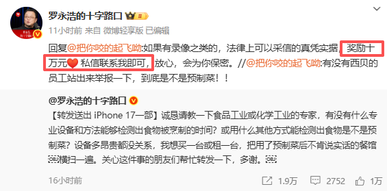 面对贾国龙的起诉表态,罗永浩迅速在社交媒体上作出回应,不仅未显退让,反而采取更主动的行动——直接发布10万元悬赏公告,公开向外界征集能证明西贝使用预制菜的“真实证据”,让这场围绕预制菜的争议从“口头对峙”推向“证据博弈”阶段。