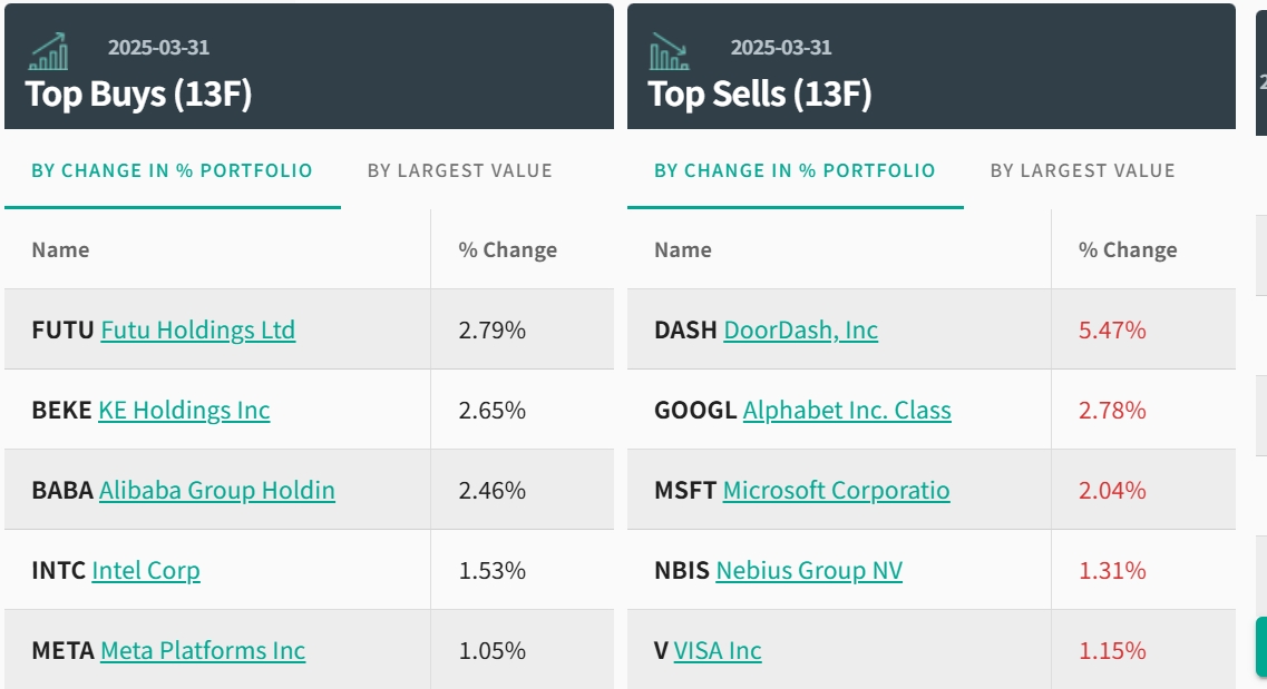 整体而言,一季度高瓴HHLR Advisors持仓总市值从上季末的28.87亿美元增至35.39亿美元,增幅接近23%,同时继续加大对中国资产的配置。