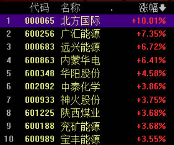 4月17日,煤炭板块持续走高,截至发稿,北方国际涨停,广汇能源涨7%,远兴能源、内蒙华电涨6%。