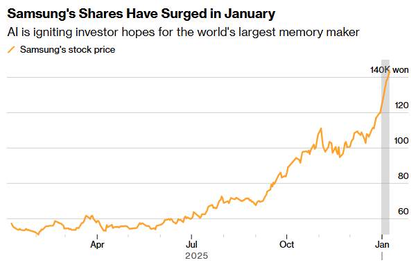三星股价在2025年的价值已翻了一番多,本月再次飙升,反映出在竞争对手美光科技(MU.US)发布乐观预测后,市场对三星今年业绩大获成功的预期。仅上周,10多位分析师就上调了三星的目标价。该公司将于1月29日提供包含净利润和各部门明细的完整财务报表。