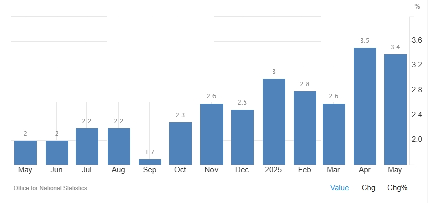 英国国家统计局周三(6月18日)公布的数据显示,英国5月CPI年率录得3.4%,符合市场预期,前值为3.5%;5月CPI环比上涨0.2%,也符合预期。